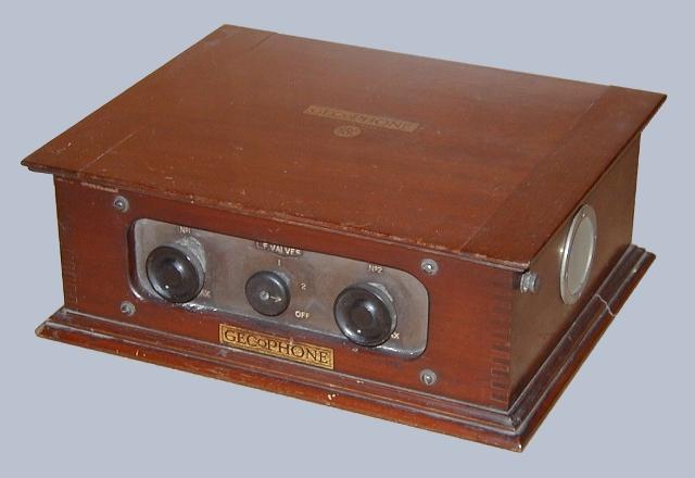 This is the GECoPHONE two valve LF amplifier model BC2580, built by GEC (UK) in 1922. It bears the BBC/PMG stamp and GPO Registration No. 3360.