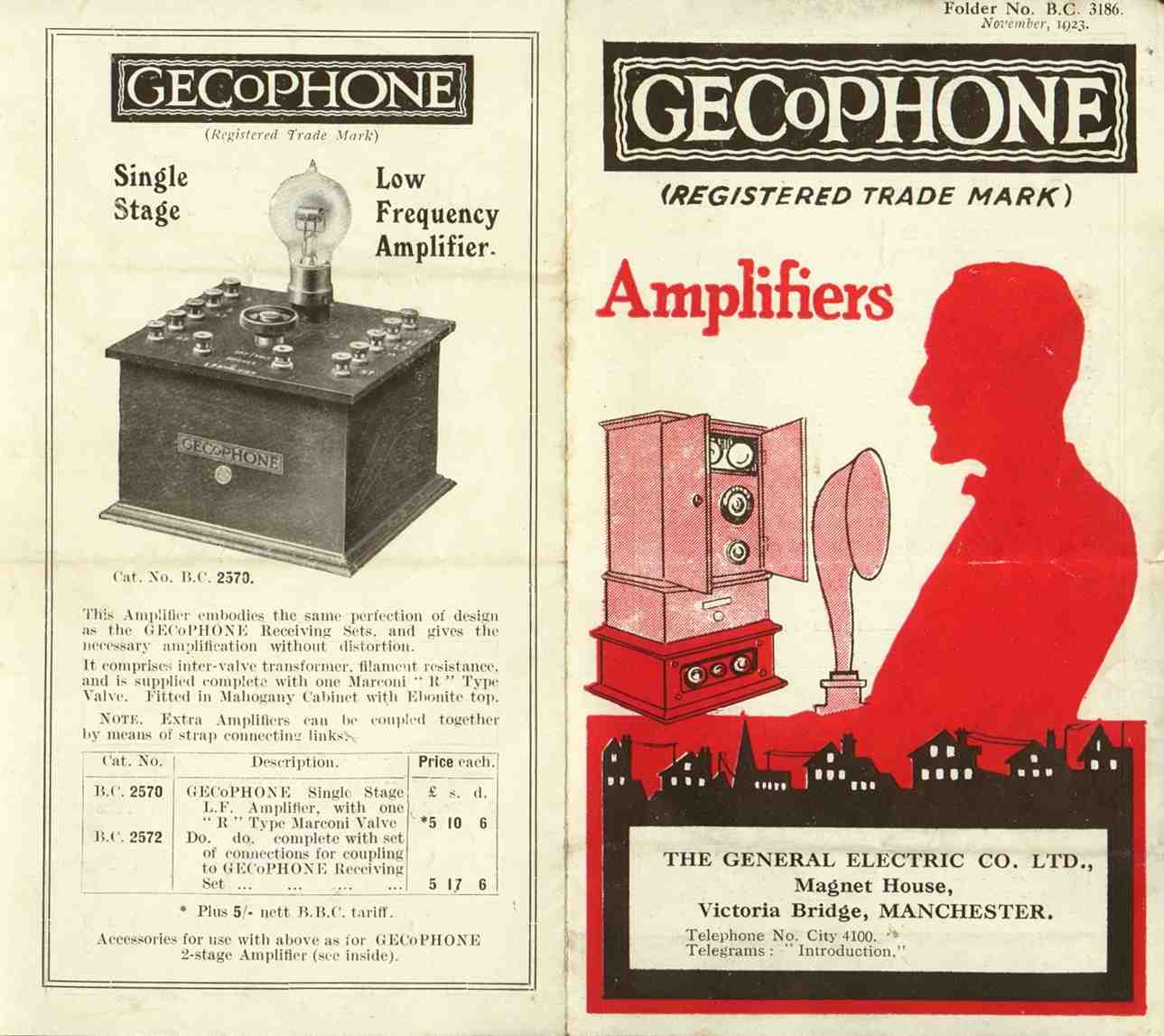 On the front page of the leaflet is shown a GECoPHONE horn loudspeaker. I have one of these loudspeakers in the museum and you can see a picture of it by clicking on the following link: GECoPHONE horn loudspeaker .