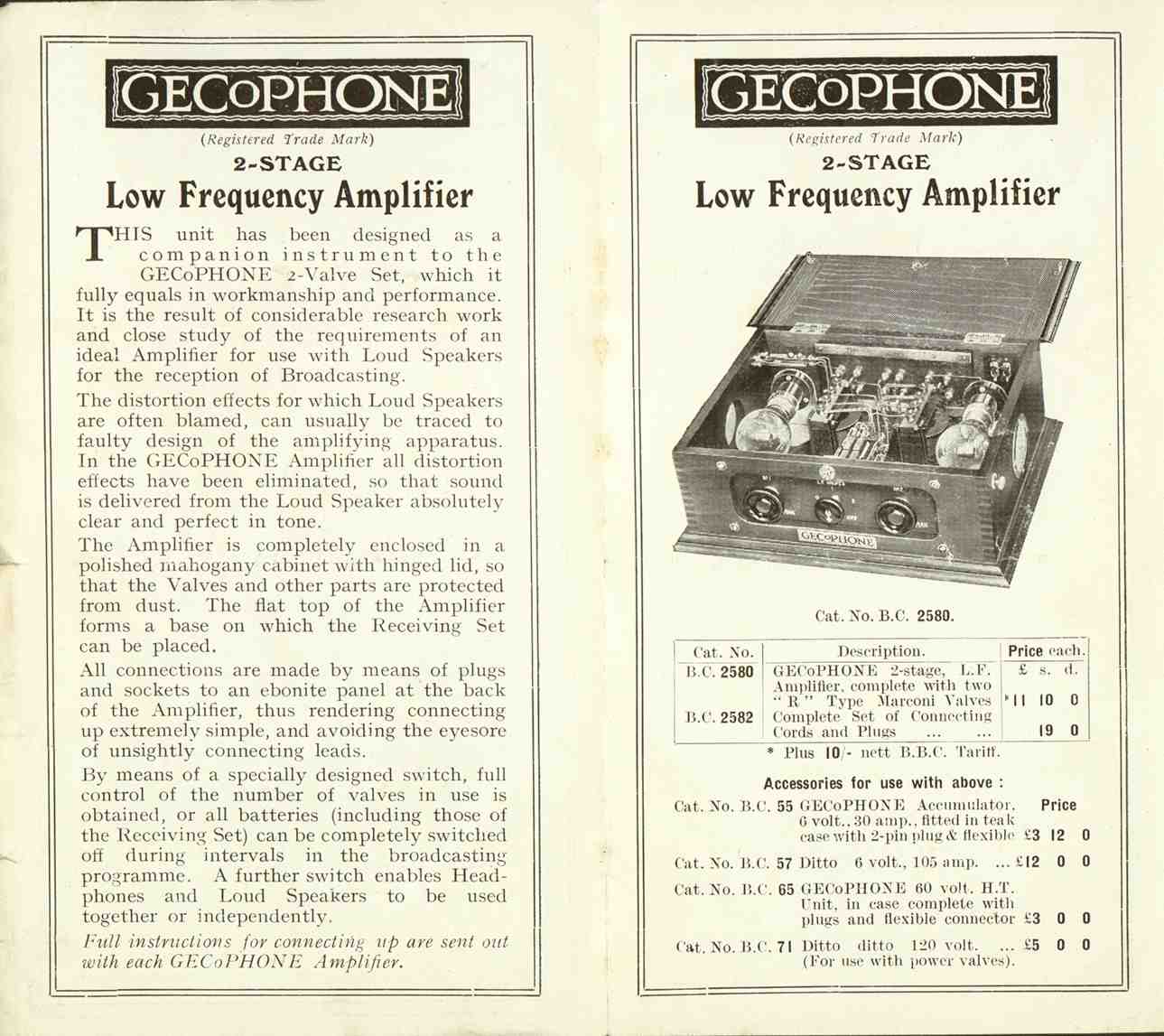 This amplifier was designed to accompany the GECoPHONE BC2001 2 valve receiver, which would normally have been stood on top of the amplifier and linked to it by means of a kit of cables BC2582 that was available separately (see leaflet below). These cables linked the HT supply from the receiver to the amplifier and also routed the LT supply via the amplifier up to the receiver.