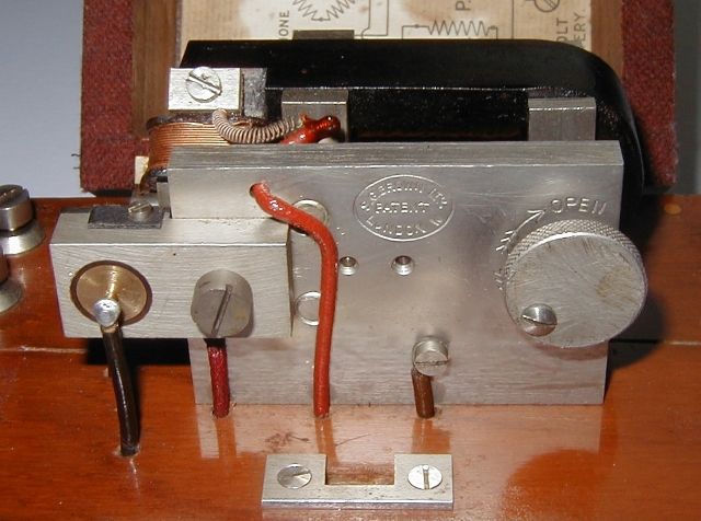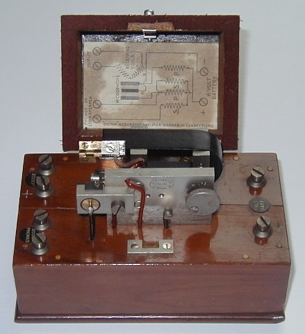 The input is applied to the 'LE' terminals (top left in the above picture and labelled 'INPUT' in the diagram). The input signal sets up a changing magnetic field in the 'RECEIVING COILS' which cause an iron reed to vibrate in sympathy. These vibrations are applied to a tiny carbon microphone (the brass component shown below, to the left of the large slotted screw). A 6V battery and the primary of a step-up transformer are connected in series with the carbon microphone. As the resistance of the carbon microphone changes in sympathy with the input signal, so the current flowing in the primary of the transformer varies. The external loudspeaker or headphones is connected to the high impedance secondary of the transformer.