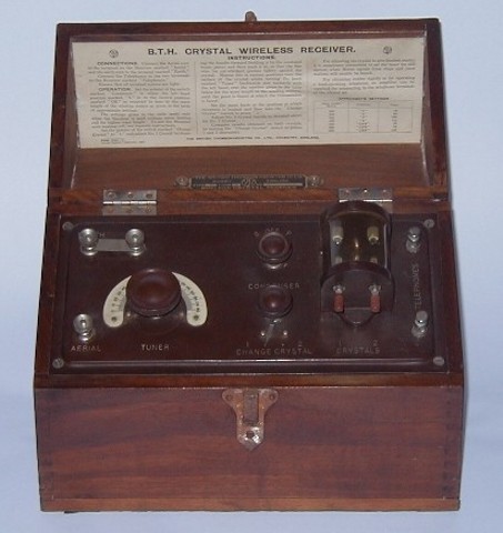 This is the BTH Type 'C' Form 'A' twin detector crystal set manufactured by British Thomson Houston Ltd. in 1924. It bears the BBC/PMG stamp marked with the GPO Reg. No. 106. The lift up lid carries the comprehensive instructions for use. The date of manufacture is printed in the lower left corner of the instruction card. This type of crystal set was manufactured by BTH from 1922 through to 1925.