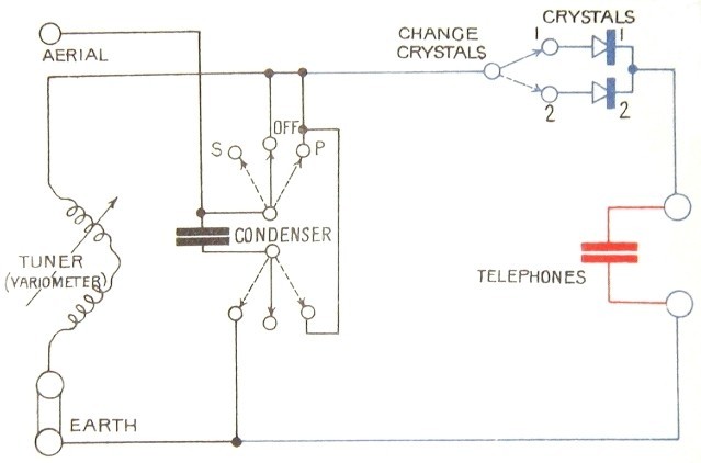 The aerial is coupled to the variometer via the 'CONDENSER' and it's selector switch. In the 'OFF' position the aerial is connected directly to the variometer tuner. This suits aerials approximately 50 feet long. Aerials up to approx. 100 feet (the maximum allowable at the time) can be accommodated by selecting the 'S' position. In this position the 'CONDENSER' is connected in series with the aerial, reducing the capacitive loading on the vartiometer to that of a 50 foot aerial. Where only a short aerial was available, the switch would be set to the 'P' position whereby the 'CONDENSER' would be connected between the aerial and earth, increasing the capacitive loading on the variometer to that of a 50 foot aerial. Keeping the capacitive loading on the variometer constant ensured a constant tuning range. Only one detector is in use at any one time, the selection being made with the 'CHANGE CRYSTALS' switch.