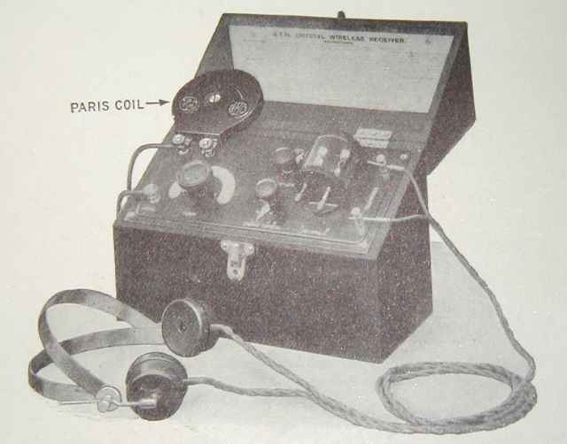 The two terminals in the earth return lead from the variometer (at top left of the front panel) were used for attaching a long-wave 'loading coil'. Coils for the Paris time signals (2600 metres) and the BBC '5XX' station (1600 metres) were available and could be connected to the terminals after first removing the shorting link. A contemporary picture (below) shows one of these loading coils in use: