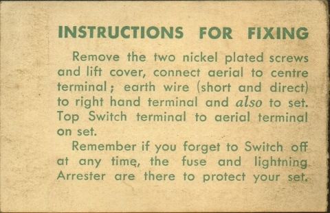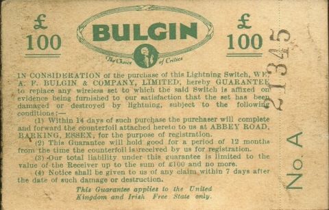 How effective the device was in practice is questionable. Bulgin were confident enough to offer a £100 limit 12 month guarantee against damage to the purchaser's wireless. I wonder what the chances are of having one's aerial struck by lightning within 12 months of buying this little switch. More chance of winning the lottery I imagine. The original box, abbreviated fitting instructions and £100 guarantee are reproduced below, along with a photograph of the original Bulgin factory where this switch would have been made.