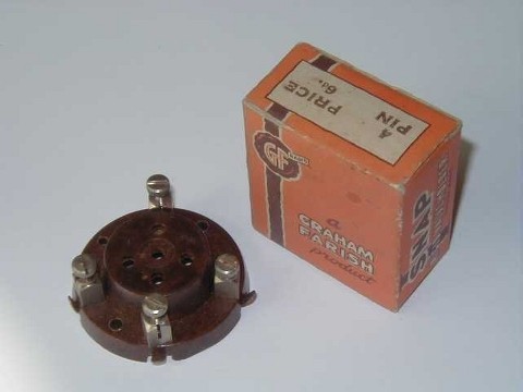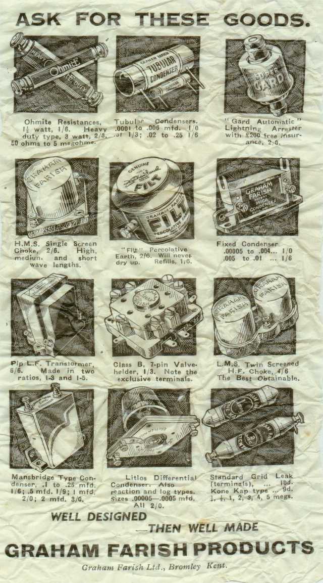 This simple 4 pin valve holder from the 1920s was designed and manufactured by the Graham Farish company (UK), and cost 6d (about 2.5 new pence). Having long since ceased producing radio parts, this company (recently acquired by Bachmann) today makes model railway carriages, coaches and locomotives under the Grafar name. The valve holder show above was wrapped in a piece of greaseproof paper that also carried advertisements for other Graham Farish radio products. The paper, somewhat crumpled after more than 70 years, is reproduced below.
