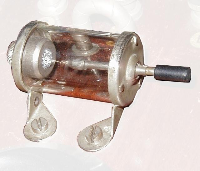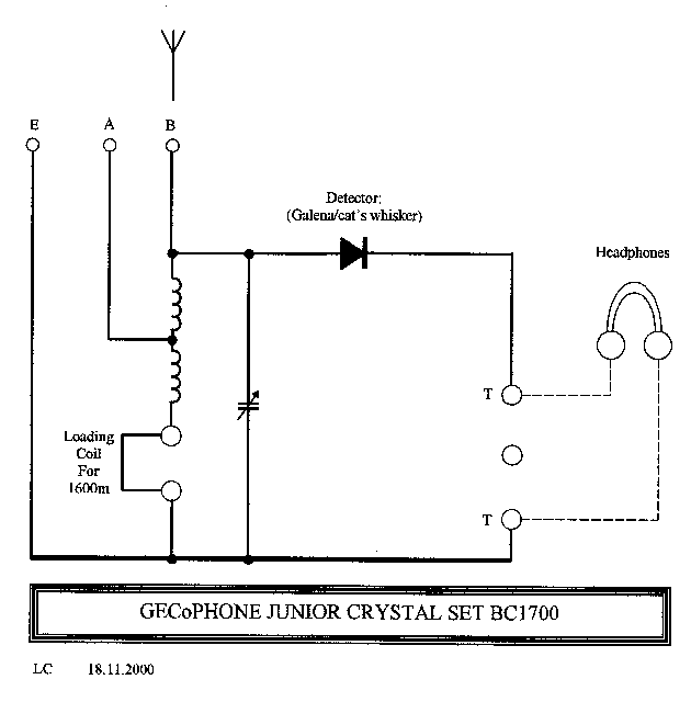 The aerial (antenna) is connected to either terminal 'A' or terminal 'B' dependant upon its length. Long aerials were connected to 'A' and medium length aerials to 'B'. A long aerial has significantly more capacitance (to earth) than a medium length aerial but the tuning control needs to have roughly the same tuning range for either. Taking the long aerial connection to a tap some way down the tuning inductor reduces its loading on the aerial tuning circuit to roughly the same as for a medium length aerial connected to 'B'. Hence the tuning range remains roughly constant. For MW operation a shorting link is fitted to the 'Loading Coil' terminals. The detector is of the galena/cat's whisker type. A picture of the detector is shown below: