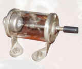 The galena crystal is held in the screw-cup to the left and the cat's whisker (a curly piece of wire) is held in a sort of pin-chuck to the right. In operation, the handle attached to the cat's whisker is carefully slid in and out and/or rotated so that the cat's whisker drags across the surface of the crystal. The crystal is covered in many contact sites that will allow rectification to take place. With careful adjustment the cat's whicker will fall upon one of these sites and a when this happens a detector is formed. Follow this link for more information on Crystal Sets. The audio output from the detector is connected to the headphones via terminals marked 'T' ('T' for 'telephones' as they were know then). Two sets of headphones can be connected in series by making use of a third, unmarked, terminal between the two 'T' terminals. Not that there is no RF decoupling capacitor connected across the audio output as was often seen on other crystal sets. No doubt the designer felt that the headphones themselves have sufficient capacitance for the task. For reception of the 15kW 5XX station on 1600 metres (broadcast from the Marconi works in Chelmsford, England) the 1600m Loading Coil could be plugged in.