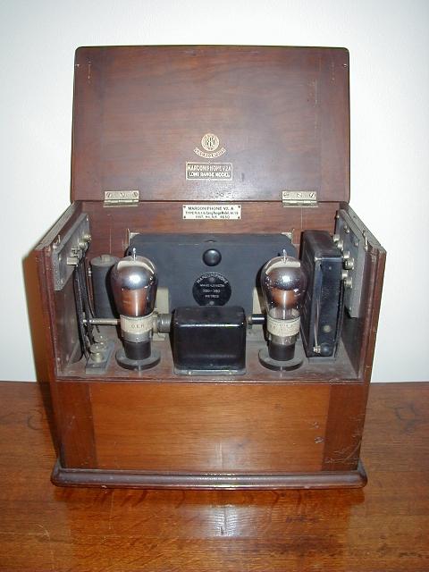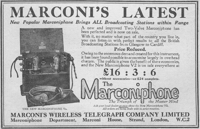 This is the Marconiphone Model V2A ('Long Range Model') manufactured in 1923 by Marconi's Wireless Telegraphy Co, Ltd. (chassis manufactured by Plessey, Holloway, London). The instrument is housed in a polished mahogany cabinet bearing the 'BBC/PMG' stamp and GPO Registration No. 0175. A contemporary advertisement for a similar model, the V2, is reproduced below. The price of £24, complete, was a considerable sum of money in 1923 and included £1 15s royalty paid to the BBC and 12s 6d per valve royalty paid to the Marconi company.