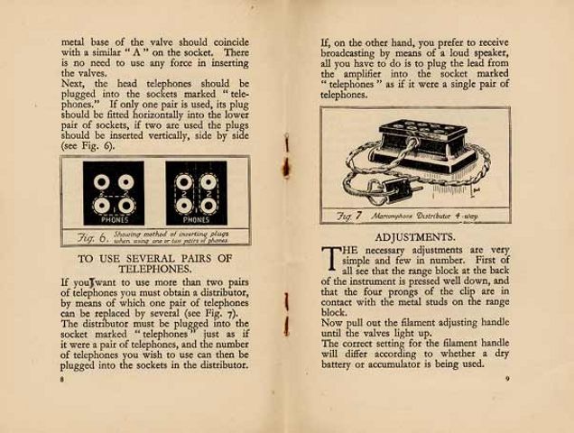 A number of plug-in tuning range blocks cover wavelengths from 300 to 2900 metres. Each block contains two 'pancake' coils which provide aerial (antenna) and RF amplifier anode-tuning respectively. A pair of ball-end tuning rods project through the side walls of the cabinet, one to the left and one to the right. To the inner end of each rod is attached a copper plate or spade. As the rods are slid in and out of the cabinet the copper plates are caused to slide across their respective pancake coils and thereby influence the tuning. The following list from a contemporary publication gives an insight into what one could receive using this set: