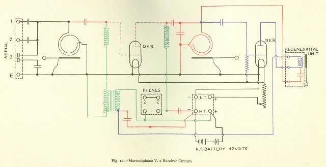 Circuit of the Marconiphone V2 Receiver from 'Wireless Telephony and Broadcasting' Vol. II by H. M. Dowsett M.I.E.E., F.Inst.P., M.Inst.R.E., pub.: The Gresham Publishing Company Ltd., London 1923. |
